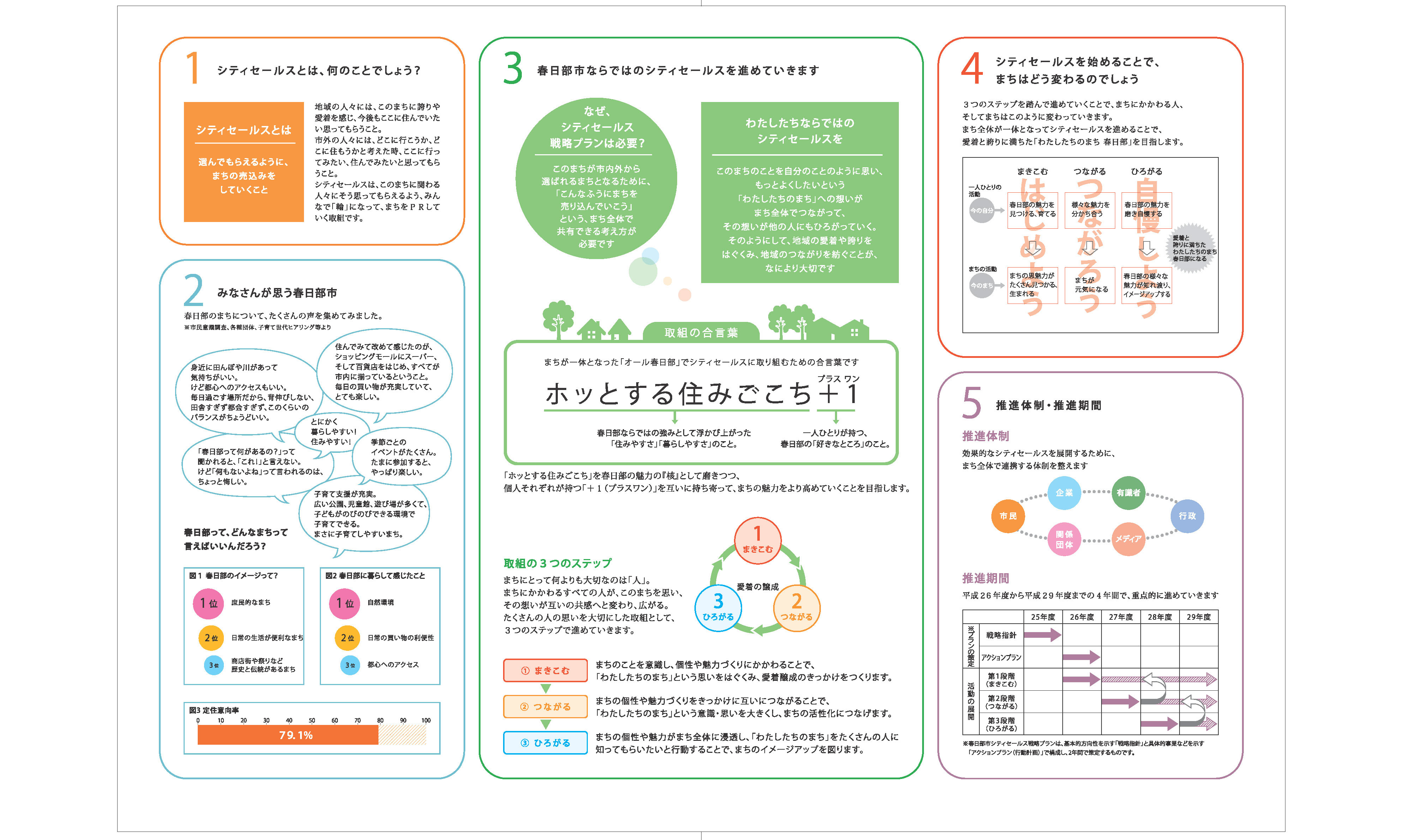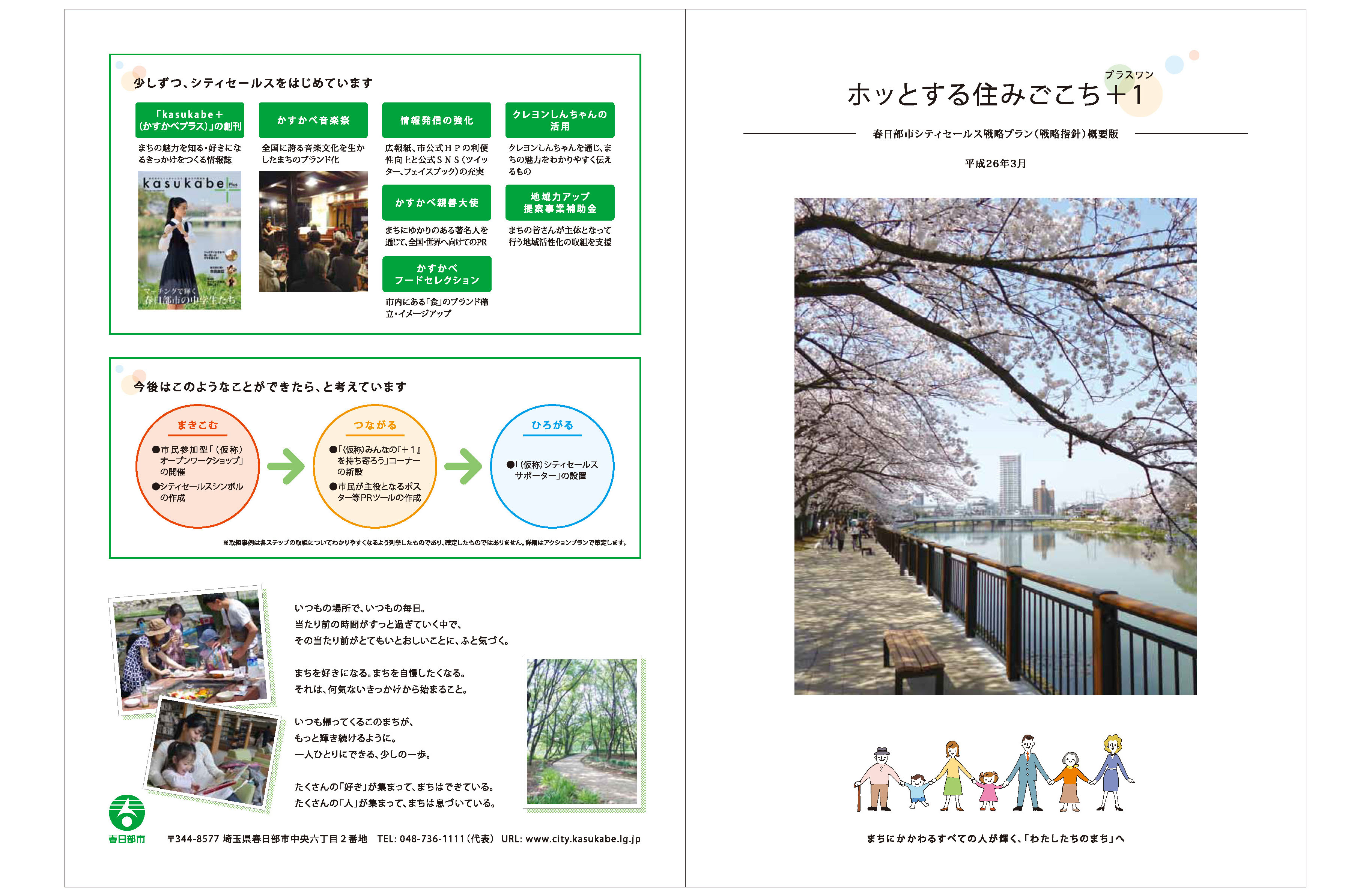策定した戦略では、市民とまち全体のオール春日部のもとでシティセールスに取り組む合い言葉として、「ホッとする住みごこち+ 1(プラスワン)」を定めました。市民の誰もが感じている暮らしやすさ=〝ホッとする〟という魅力と、市民一人ひとりが持っている春日部の好きなところ=〝プラスワン〟を共有しながら、人と地域がつながり、「わたしたちのまち春日部」が生まれることをめざしました。