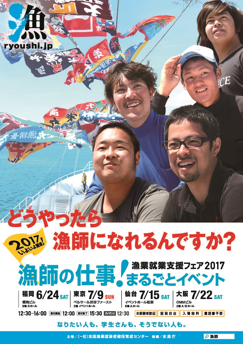 プロジェクト紹介漁業への新規就業を促進することを目的に、就業希望者に向けた情報発信、受入漁業者とのマッチングイベント(漁業就業支援フェア)などを行い、漁業研修生の確保につなげた。平成29年度は、漁業就業支援フェアを東京・大阪・福岡・仙台の4都市で開催し、約800名の就業希望者を集客した。