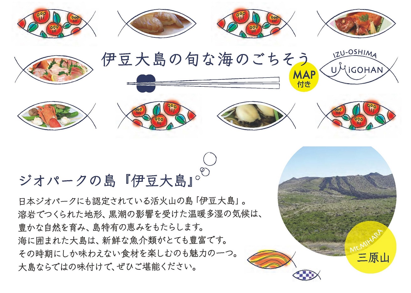 大島町の水産業振興及び観光振興を図るとともに、東京諸島ブランドとして島しょ全体の水産物流通を活性化することを目的に、昨年度に検討したブランド化の方向「年間を通じて美味しい水産物が食べられる島・大島のイメージの確立」の実現に向けた取組をおこなった。とこぶしを中心とした貝類を使った特産品を開発するとともに、島の水産物のイメージアップを図るためのPRツール(お魚マップ)を作成し、島内イベントにてお披露目を行った。