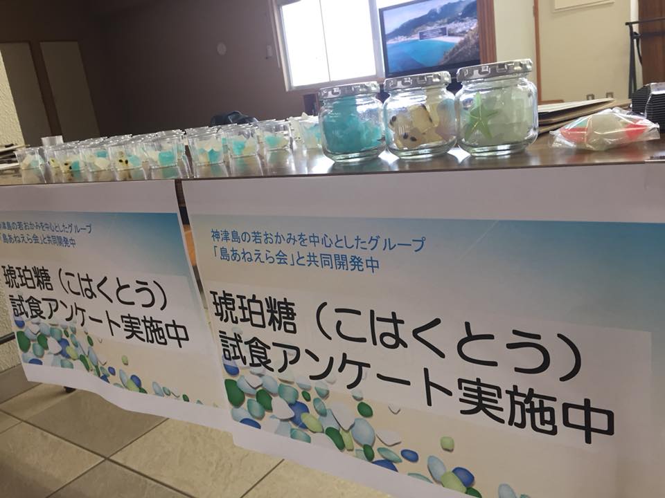 神津島のおもてなし力の向上に向け、神津島産テングサを用いた「おてなし島スイーツ」を開発することを目的に、昨年度に設置した、若おかみなど島のこれからを担う世代をメンバーとした「意見交換会」において、レシピのアイデア出し、試作品づくりおよび試食会を行い、テングサやパッションフルーツ等の島の特産品を使った『琥珀糖』のレシピを開発した。おもてなし向上に向けた取組を継続するために、意見交換会メンバーを中心に『島あねえら会』を立ち上げ、専用Facebook等で情報発信を行った。