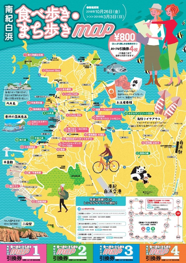 (一社)南紀白浜観光局の収益事業の構築及び、閑散期対策、消費単価の向上に寄与する着地型観光サービスとして確立することを目指し、有料のまち歩きマップ販売事業を行った。お土産店や飲食店のサービス・商品を観光商品として位置づけて、マップには、飲食店やお土産店等の紹介とその商品・サービスと交換できる引換券(温泉入浴券含む)を付けて販売した。