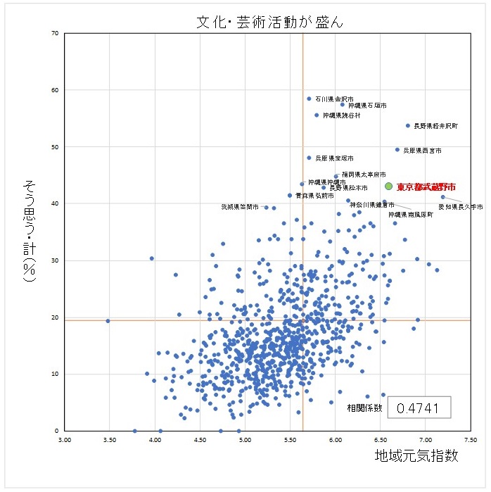 全国の男女10万人を対象に、現在自分が暮らす地域がどのくらい元気かを1~10点で採点してもらい、その平均値を「地域元気指数」として定点観測する自主調査を実施。今年で7回目。地域の元気の要因となる47指標について住民の評価を聴取、県単位や市町村単位での分析が可能。今年は図書館等の文化施設が地域に与える影響を分析。全国では元気度との相関は小さいが、武蔵野市など、文化施設への評価が元気度との相関の上位にくる市もあり、少なからず影響があることを明らかにした。