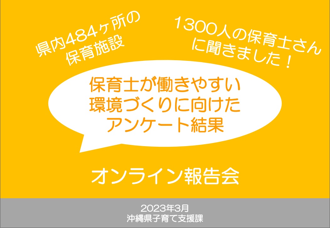 沖縄県内の保育施設では、必要な保育士数が確保できず定員割れが生じるなど、保育士不足が深刻である。そこで、保育士の労働環境や人材確保の実態を把握するための調査を実施した。6割弱の施設から回答があり、課題意識の高さがうかがえたとともに、離職率の低い施設に対するヒアリング、保育士のグループインタビューを実施し、保育士に好評な取組みを収集、調査結果はオンライン報告会で公表し、保育士の働きやすい環境づくりに向け、前向きな取組みの方向性を共有した。