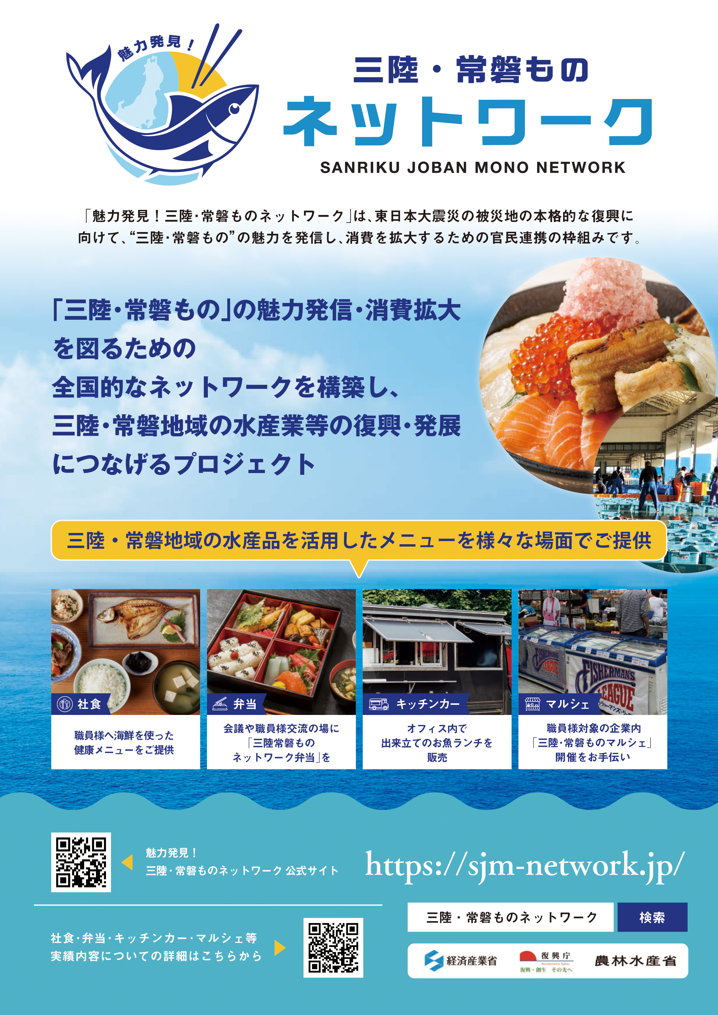 経済産業省では、三陸・常磐地域の水産物等の魅力を発信し、消費を拡大することを目的に、売り手と買い手をマッチングする官民連携プロジェクト「魅力発見!三陸・常磐ものネットワーク」を2022年12月に立ち上げた。本事業では、三陸・常磐ものの魅力を発信するとともに、水産物の消費を維持・拡大することを目的に、企業・団体・自治体が参画するための枠組みの構築およびネットワークの運営に向けた各種事務局業務をサポートした。