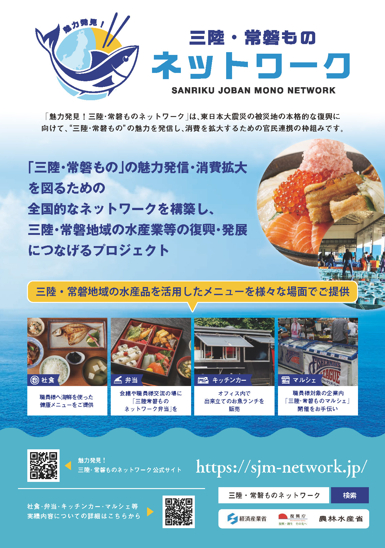 「魅力発見!三陸常磐ものネットワーク」は、三陸・常磐地域の水産物等の魅力を発信し、消費を拡大することを目的に令和4年12月20日に経済産業省が立ち上げた、売り手と買い手をマッチングする官民連携プロジェクトである。本事業では、三陸・常磐ものの魅力を発信するとともに、水産物の消費を維持・拡大することを目的に、企業・団体・自治体が参画するための枠組みの構築およびネットワークの運営に向けた各種事務局業務をサポートした。