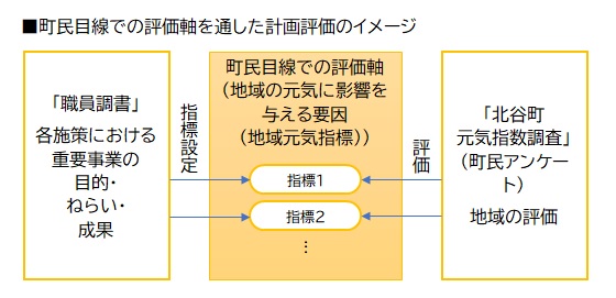第六次北谷町総合計画前期基本計画の進行管理を行うための評価方法について検討・提案をおこなった。北谷町総合計画で掲げている町民と行政の協働による「まちづくりの目標」に共感することが評価の重要な視点であることから、町民が主観的に評価を行う地域元気指数調査を活用した評価方法を模索した。具体的には、職員と町民の両方に同じ評価軸で調査を実施し、施策・事業の目的と町民の評価を結びつけることで、施策・事業の住民生活への寄与度を測る方法を検討した。