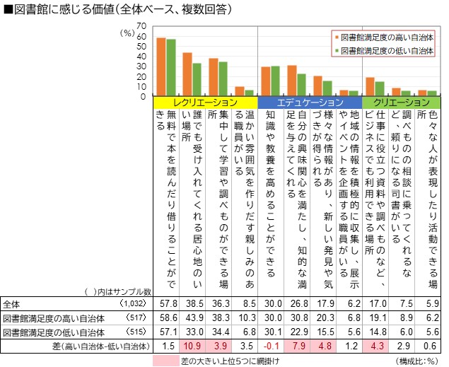 全国の男女10万人を対象に、住んでいる地域の元気度や、元気の要因となる50指標+公共施設の満足度5項目の評価を聴取した(経年9回目)。また、図書館満足度上位・下位の自治体の住民に追加調査を行い、地域における図書館の価値を確認した。さらに日本不動産学会「不動産のWell-beingを測る」をテーマとしたワークショップで研究報告をおこない、住民の主観的評価によってエリア(地域)の価値を測る手法について示した。
