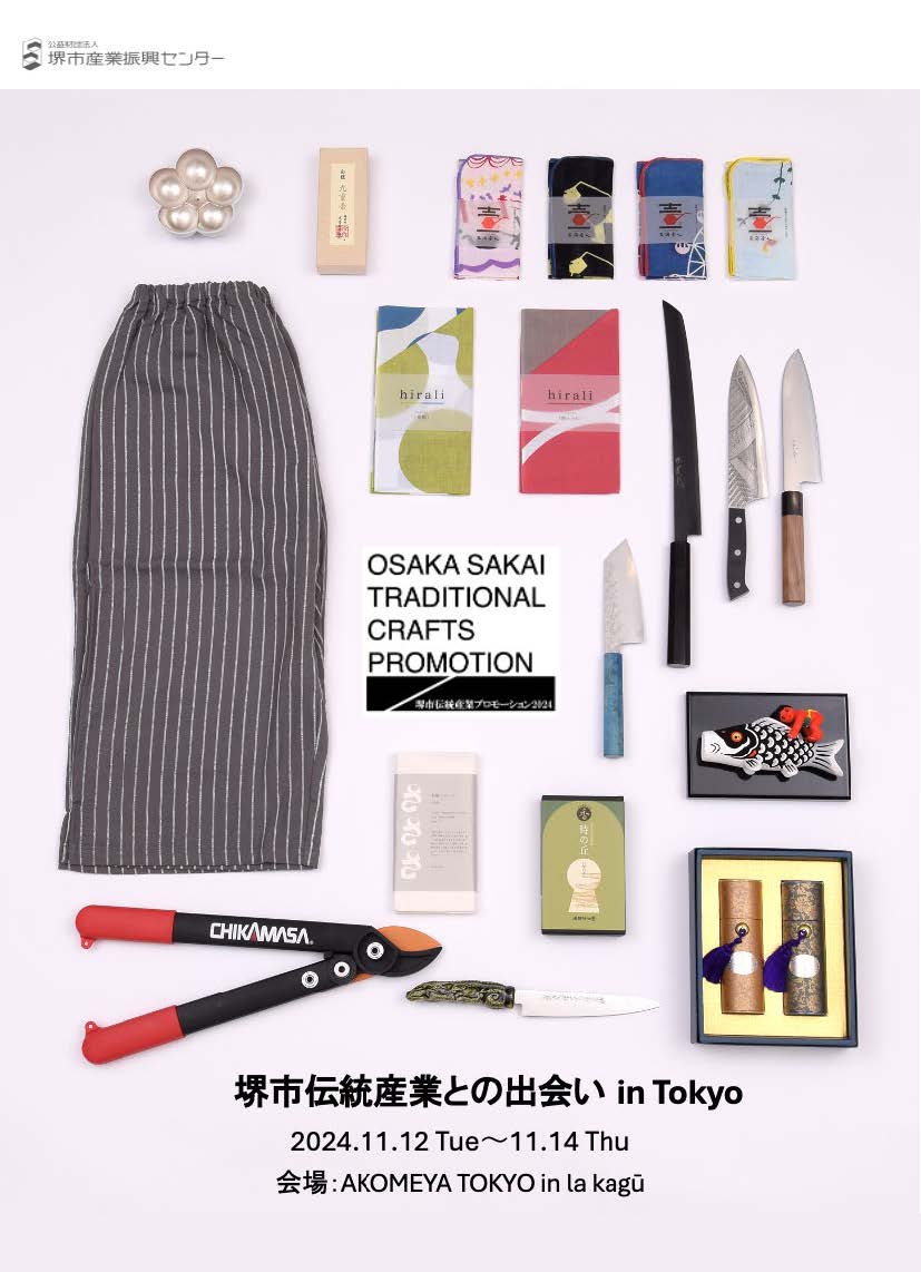 堺の伝統産業品(打ち刃物・注染和晒・線香・鯉幟)のプロモーションとして、バイヤーやメディア関係者等計53名を招待した3日間のイベントを都内会場で開催した。会場での商品展示のほか、伝統産業品に関するトークショーを実施し、堺のものづくりの魅力を広く発信した。参加者からはマッチング希望をアンケートで収集し、成果は商談・取材のマッチング31件、バイヤーとの成約・商談継続9件、メディア掲載10件となった。